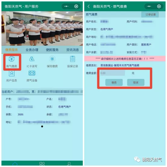 3、進入主頁面點擊用氣繳費進行氣費儲存。(普通機表直接繳費即充值成功)